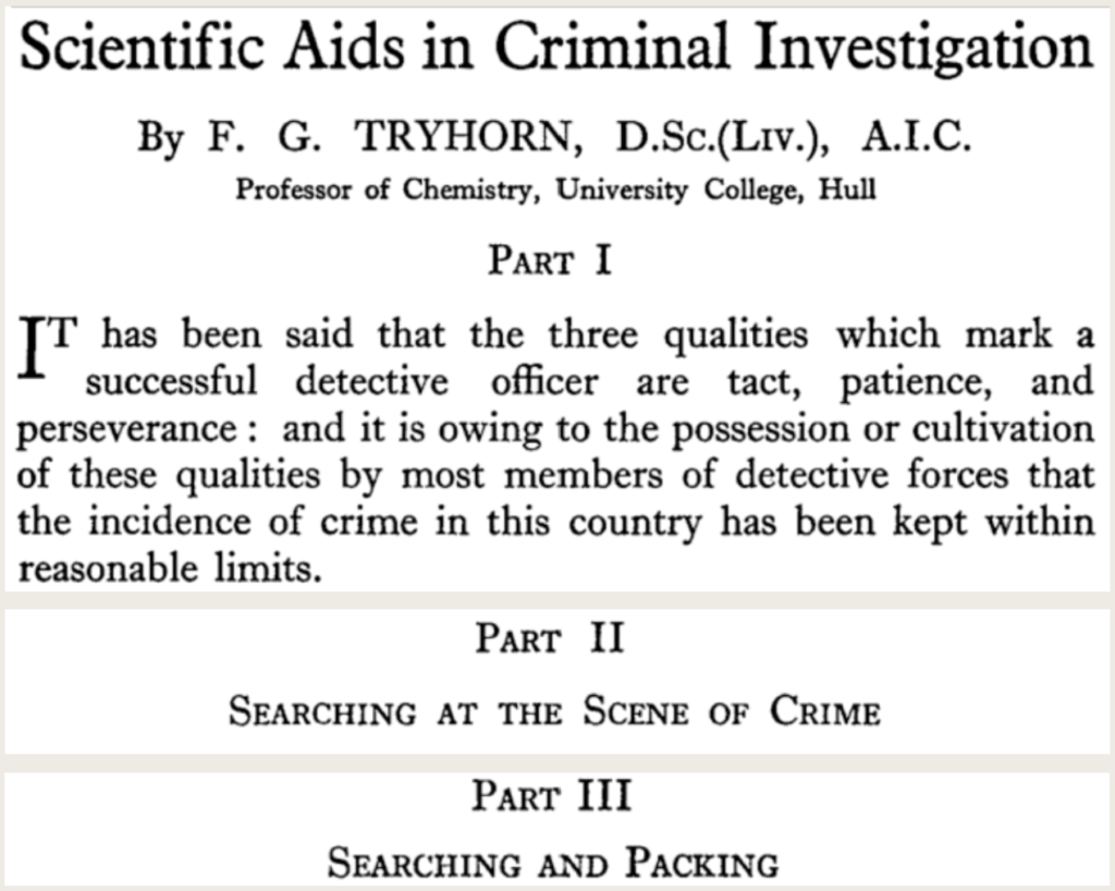 Another early work in the field was Forensic Chemistry and Scientific Criminal Investigation by Alfred Lucas, first published in 1920.  Lucas was a British analytical chemist who had worked alongside Howard Carter in his Egyptian archaeological excavations.  The book was highly detailed and a basis of forensic science in the UK for several decades.  Lucas was also a correspondent of Nigel Morland, a crime fiction writer from the 1930s through the 1970s who would reference Lucas’s work throughout his fiction.